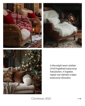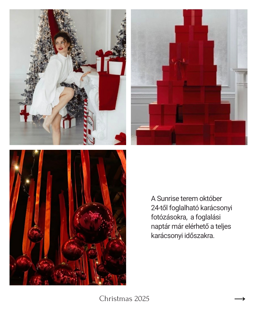 A karácsonyi dekorációt október 28-án adjuk át mindkét teremben, azon a hétvégén már tudtok jönni hozzánk karácsonyi fotózásokra. Hogy biztos lehess benne, hogy akkor és ott tudsz fotózni ebben az időszakban, ahol és amikor szeretnél, már nyitva a foglalási naptárunk, egészen december 31-ig, így nyugodtan tudsz előre foglalni.