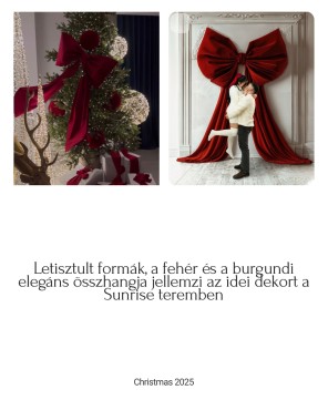 bordó - fehér - játékos, mégis elegáns dekorációval vár majd titeket. A piros bogyók vidéki romantikát, a piros fehér csíkos kiegészítők játékosságot kölcsönöznek majd a térnek. Lesz idén is „gyerek sarok” ezúttal piros kisautón fenyőt szállíthatnak majd a legkisebbek.